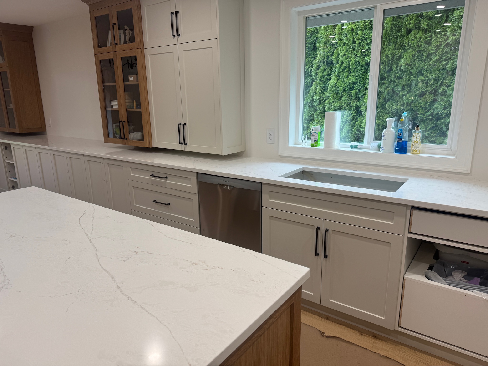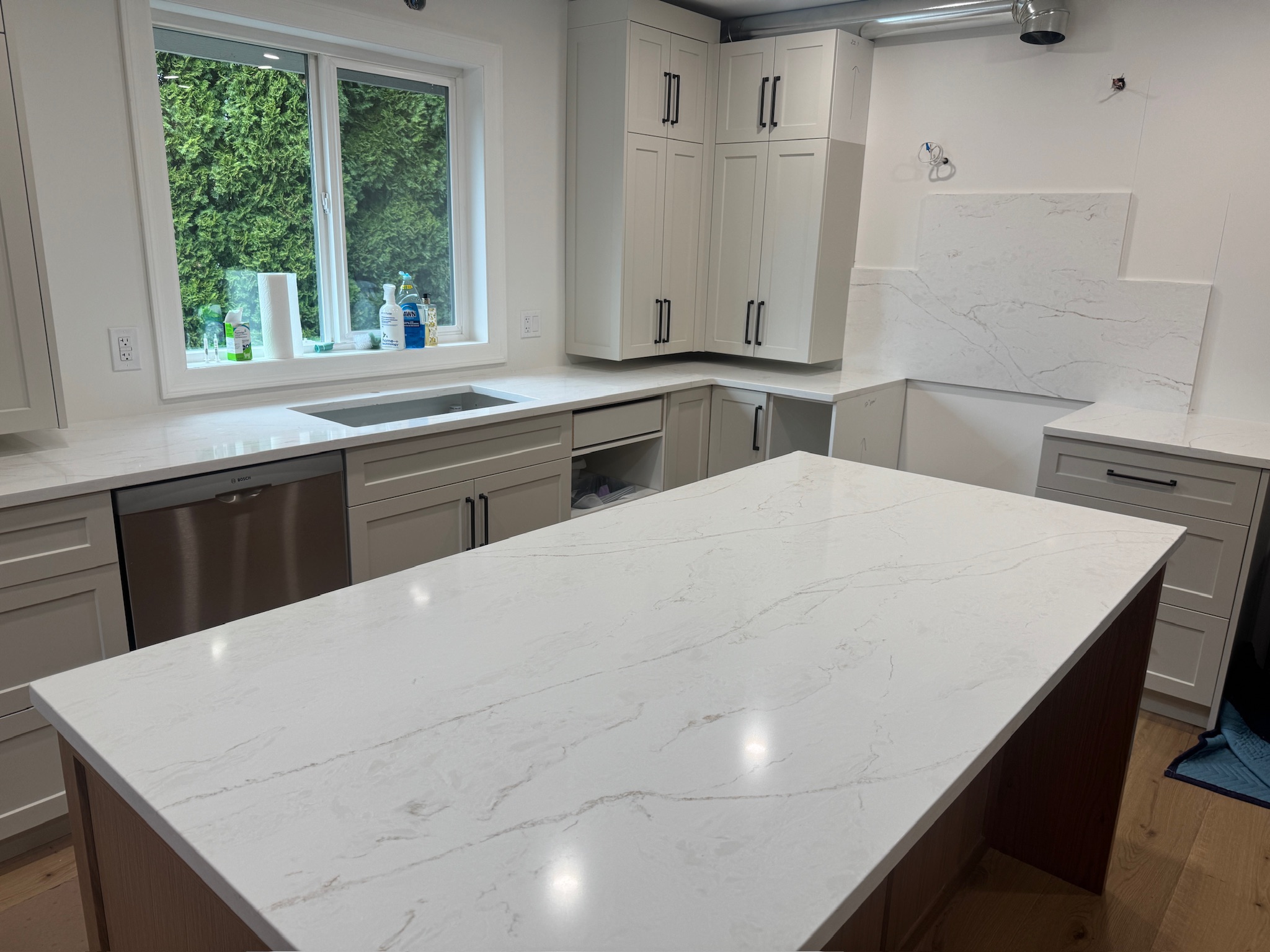 This Chilliwack kitchen project features a refined kitchen quartz countertop installation using Vicostone Marmoris, delivering a timeless marble-inspired aesthetic with modern durability.