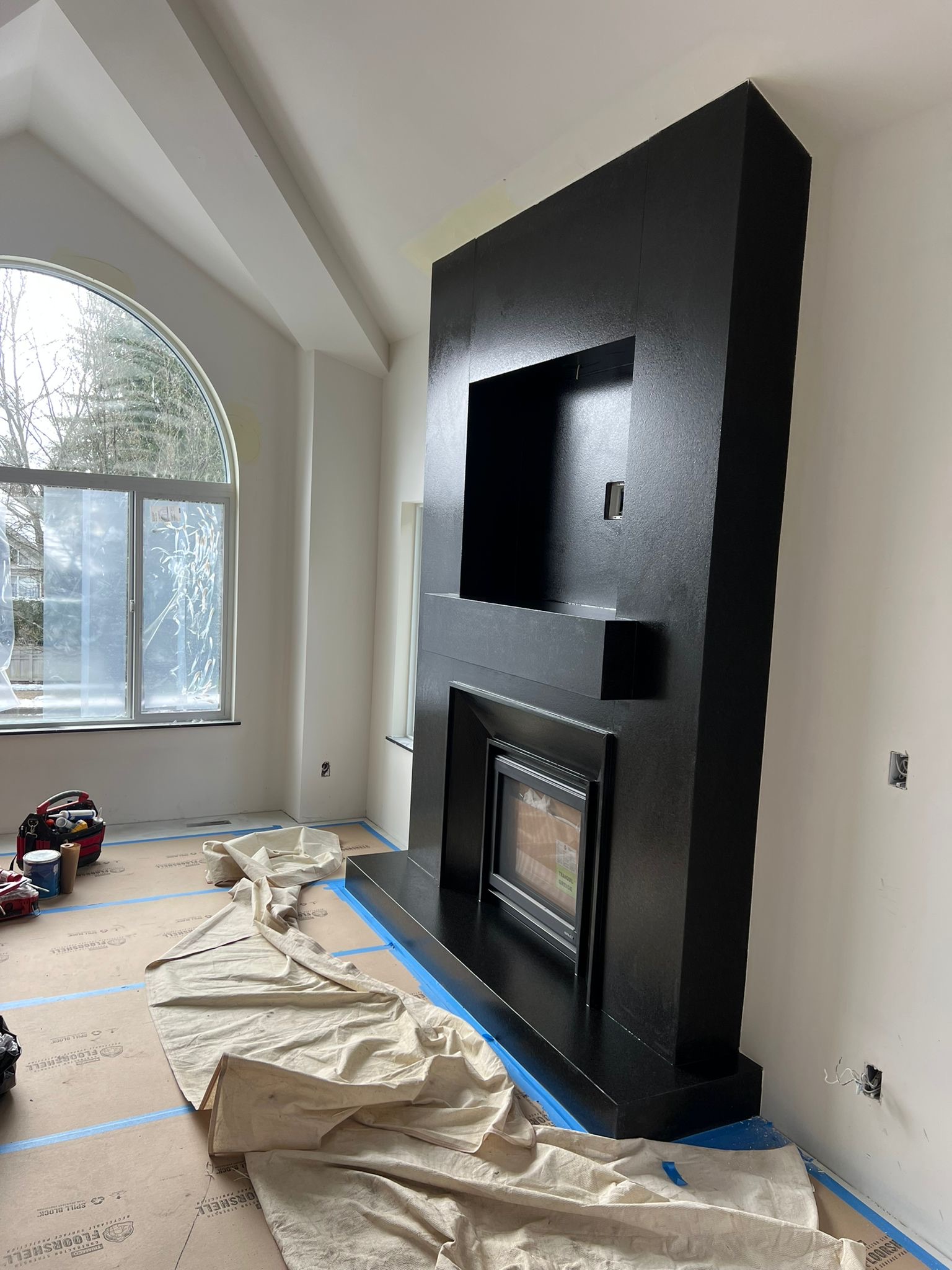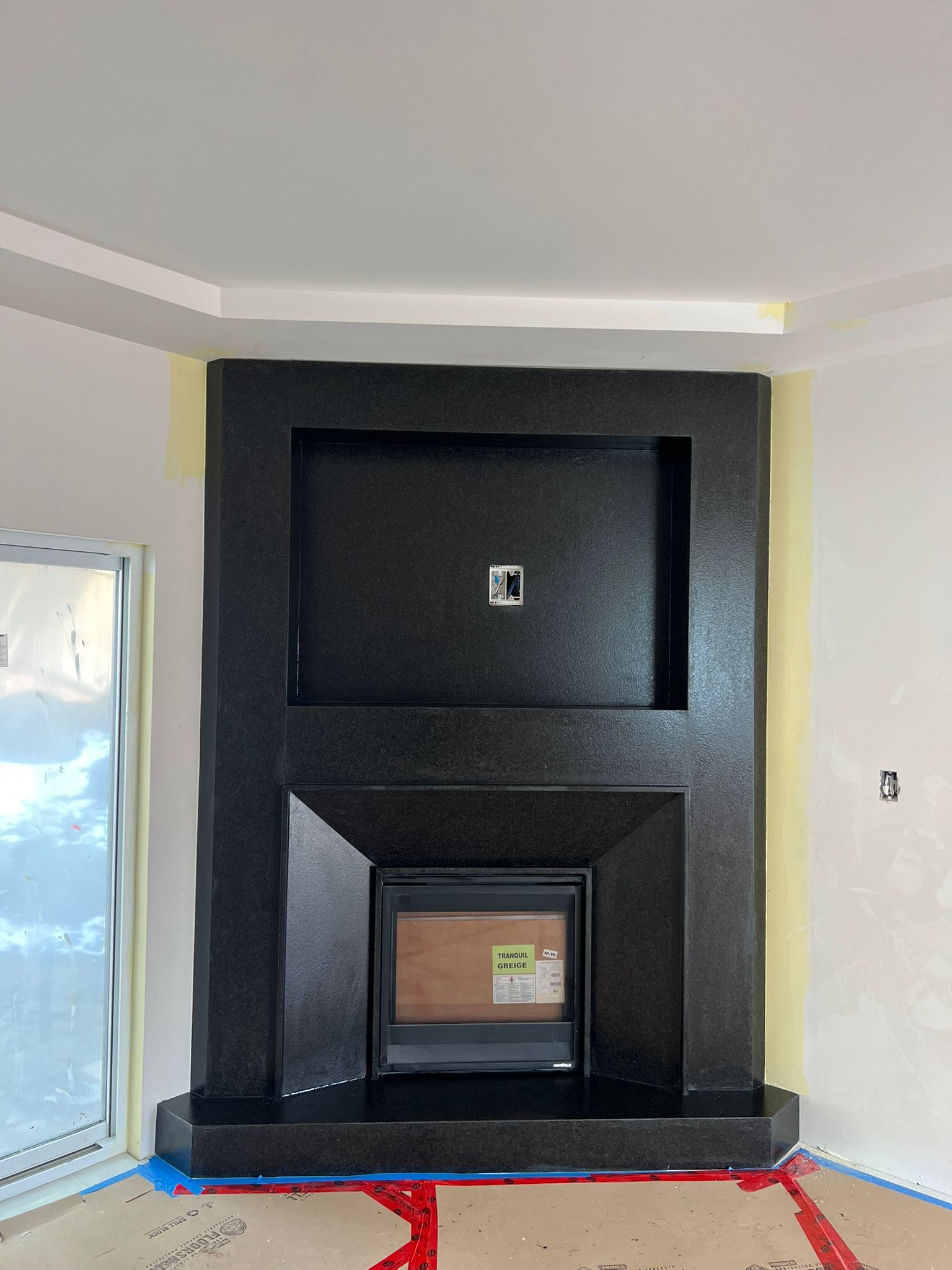 This custom granite fireplace feature wall was designed, fabricated, and installed in Coquitlam, BC, delivering a bold and modern architectural focal point.