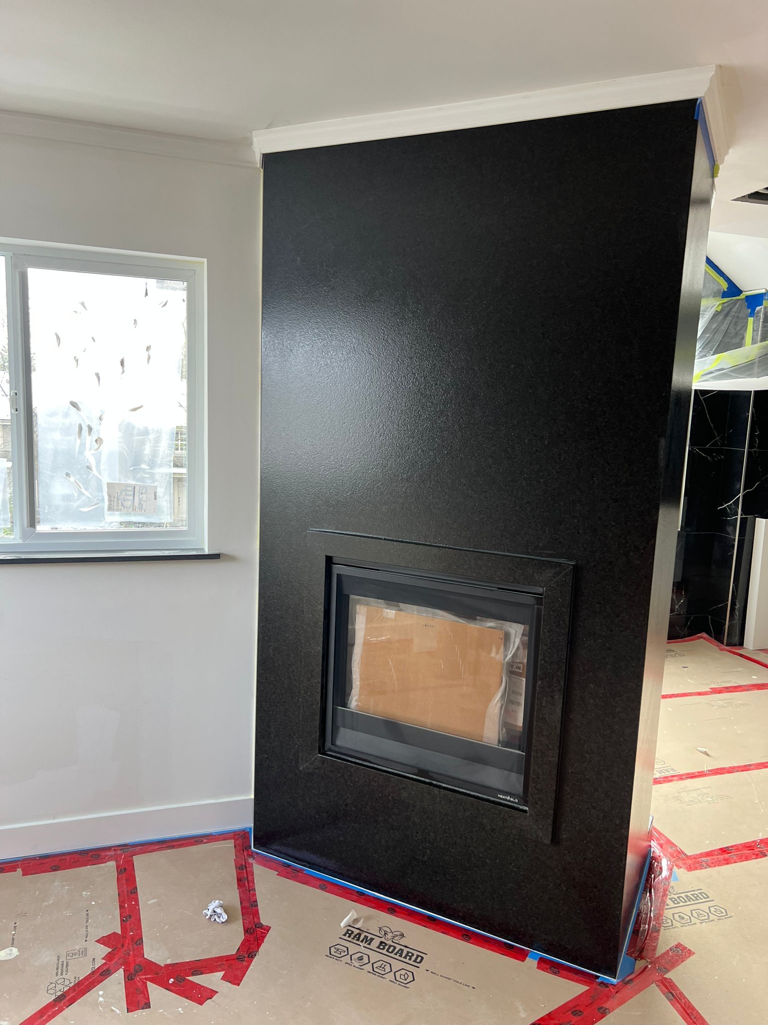 The project includes a full-height stone cladding system with a deep matte-textured black granite finish, creating a seamless and monolithic look from floor to ceiling.
