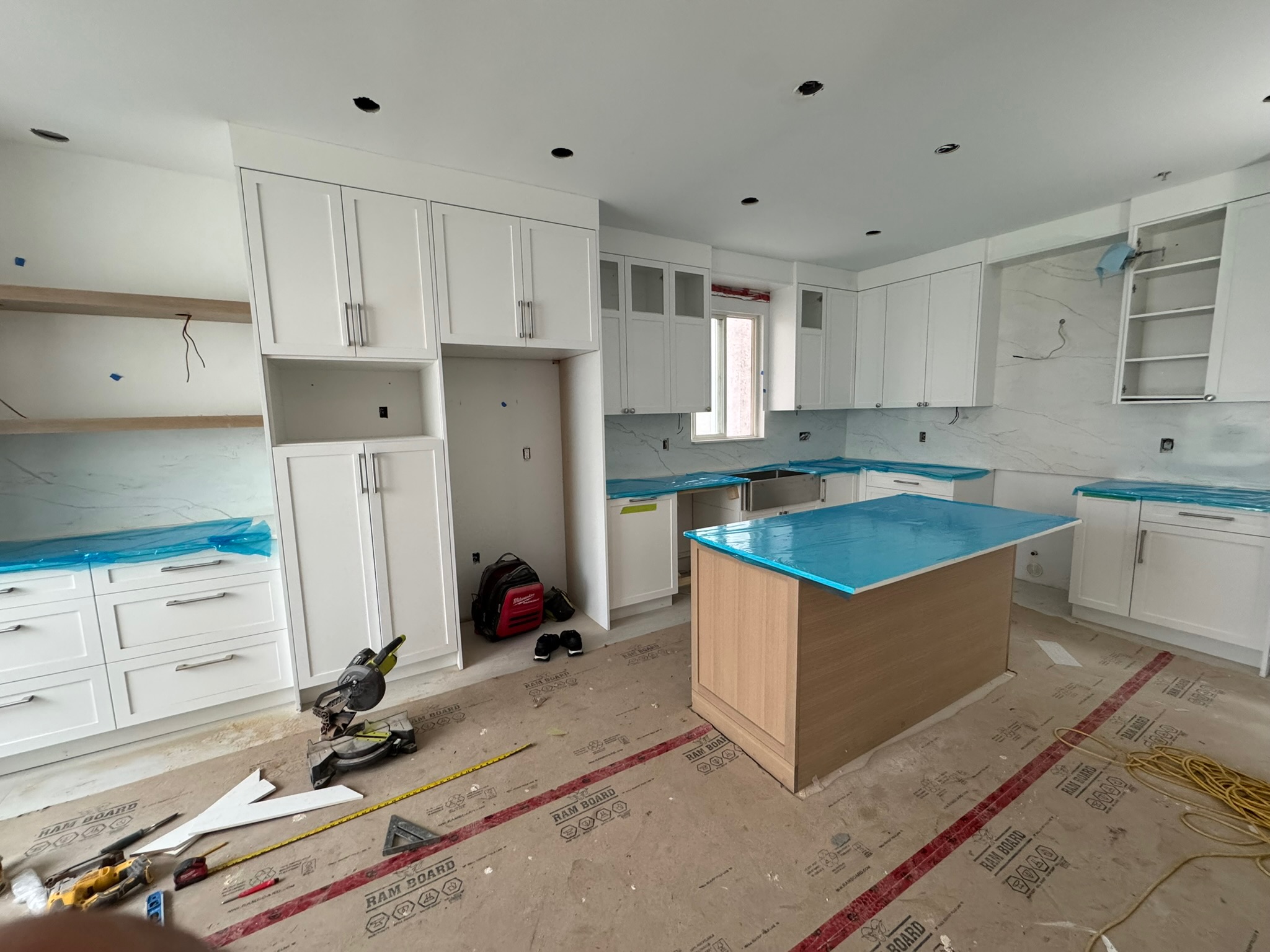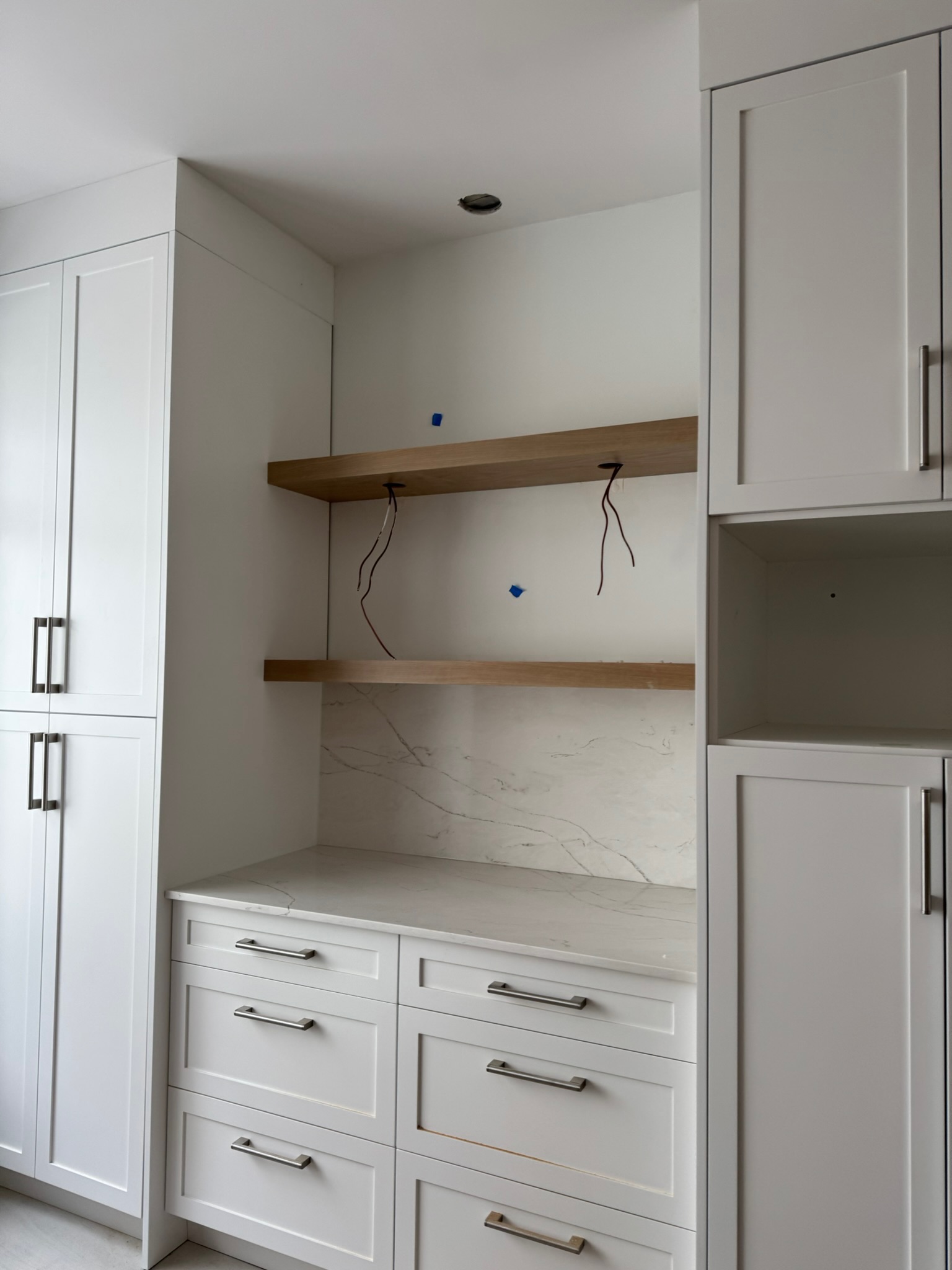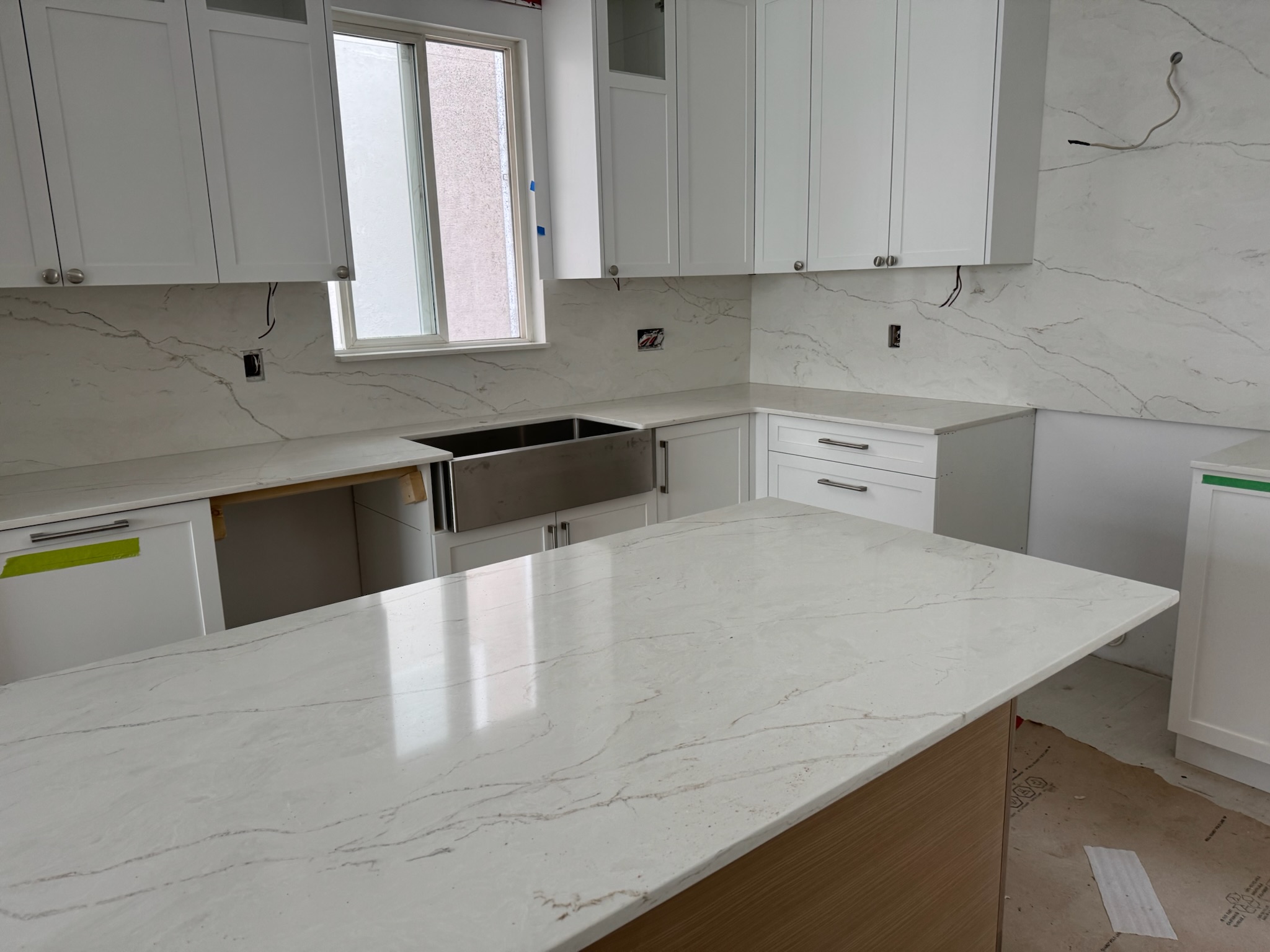 The project focuses on creating a bright and seamless space by combining quartz countertops and matching backsplash, allowing the natural flow of the material to unify the entire kitchen.