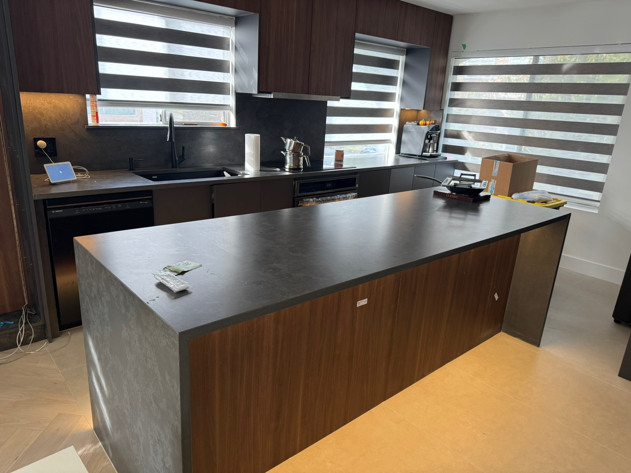 The centerpiece of the space is a custom island with double waterfall edges, seamlessly wrapping the stone down both sides to form a clean, continuous structure.