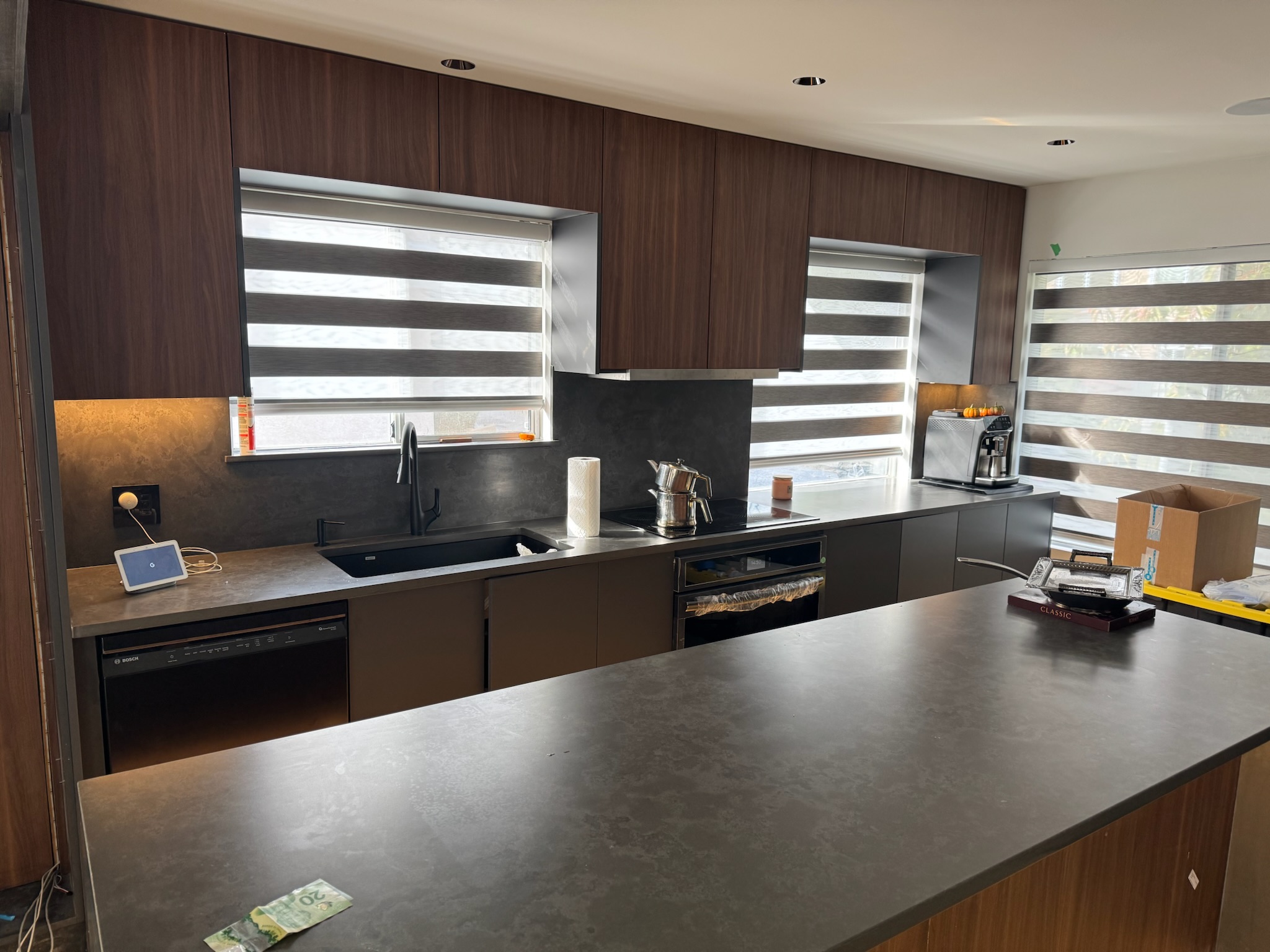 This North Vancouver kitchen project features a bold and modern kitchen quartz countertop and backsplash installation using Vicostone Tartufo, designed to create a strong architectural presence with rich, dark tones.